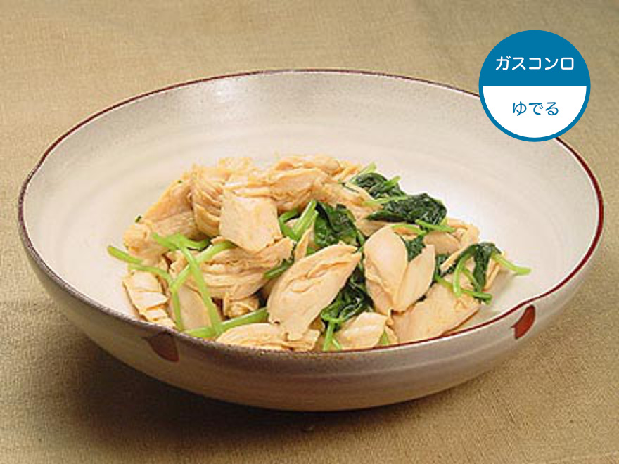 鍋に湯を沸かしてささみをゆでる。火が通ったら、熱いうちにボウルの中で身を細くほぐしておく。