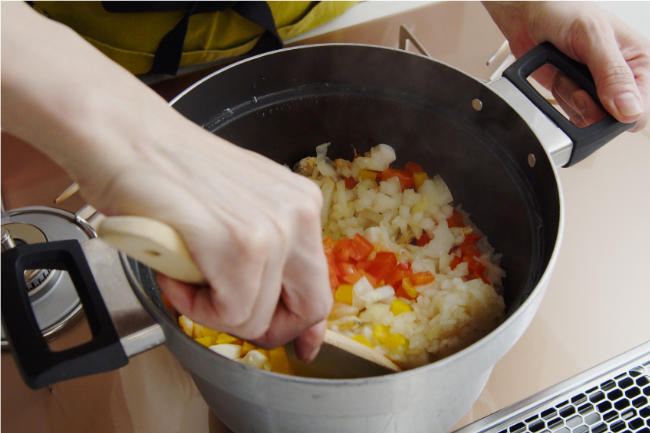 オムライスのピラフは、炊飯用の鍋を使ってガスコンロで炊いてみて。「炊飯」や「ごはん」モードがあれば、スイッチポンで火加減はコンロが自動調整してくれます。短時間でふっくら炊き上がり、おいしさもバツグン!